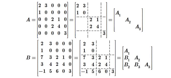 其中 . 依分块矩阵的乘法要求, 的行的分法必须与 的列的分法相一致, 而 的列可以任意分. 因此为计算方便,将 分块如下