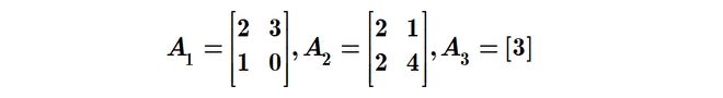 把 视作以 为元素的形式上的 矩阵,称为分块矩阵,或称为对矩阵 的分块,每个小矩阵 称为 的子块.