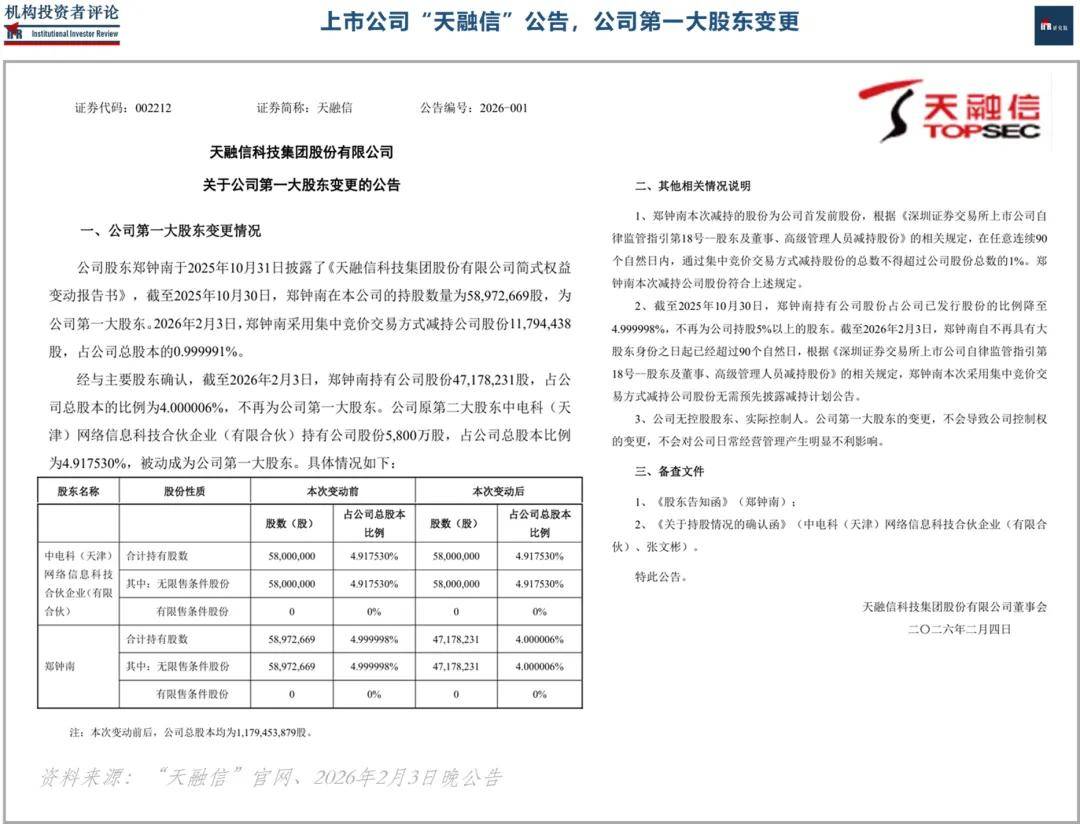 要特别一提的是,“中电科成都网络安全基金”此前还间接是另一家网络安全领域的上市公司“天融信”(创始于1995年,深交所主板)的第二大股东,而就在刚刚(2026年2月3日晚),上市公司“天融信”发布公告,称公司第一大股东郑钟南由于今日(2月3日)采用集中竞价交易方式减持公司股份约1179万股(占公司总股本的0.999991%),导致其持股比例降至4%;而公司原第二大股东“中电科(天津)网络信息科技合伙企业(有限合伙)”持有上市公司5800万股,占公司总股本比例约为4.92%,这导致“中电科(天津)网络信息科技合伙企业(有限合伙)”被动成为“天融信”第一大股东。上市公司如今无控股股东和实际控制人。
